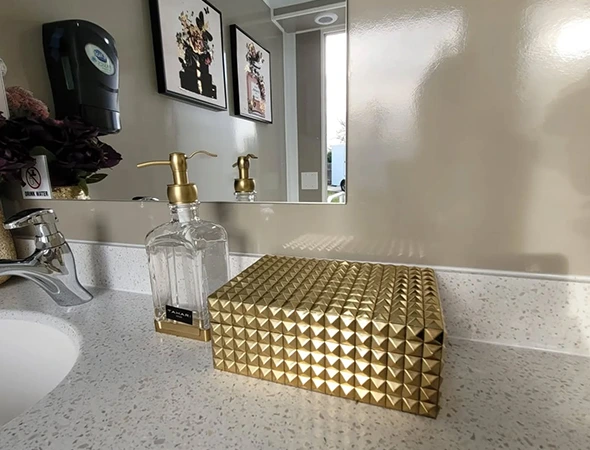 Modern interiors, tasteful finishes and premium flooring add sophistication to your event, seamlessly blending restroom trailers with your wedding, party, or corporate celebration décor.